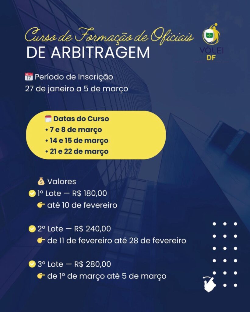 Já estão abertas as inscrições para o curso de formações de novos árbitros e apontadores para atuarem nas competições da FVDF e demais competições a que tiverem oportunidade. As inscrições iniciaram em 27/01 e vão até o dia 05/03. O curso acontecerá nos dias 07 e 08/03, 14 e 15/03 e 21 e 22/03. Os valores de inscrição dos cursos variam de R$ 180,00 para o primeiro lote e R$ 280,00 para o 3º lote.