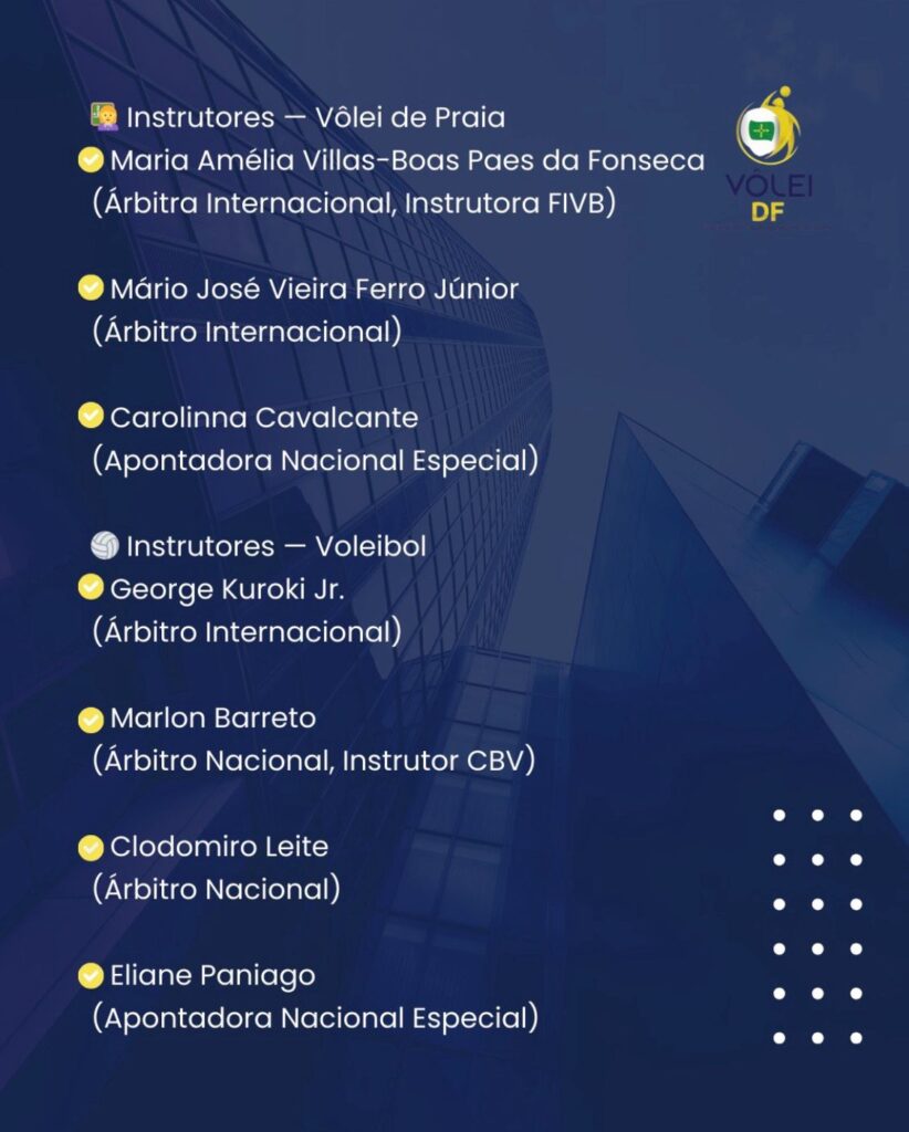 O Curso contará com os Instrutores de Vôlei de Praia: Maria Amélia Villas-Boas Paes da Fonseca (árbitra Internacional); Mário José Vieira Ferro Júnior (Árbitro Internacional) e Carolinna Cavalcante (apontadora Nacional Especial). Os de Quadra Serão George Kuroki Jr. (Árbitro Internacional); Marlon Barreto (Árbitro Nacional, Instrutor CBV); Clodomiro Leite (Árbitro Nacional) e Eliane Paniago (Apontadora Nacional Especial).